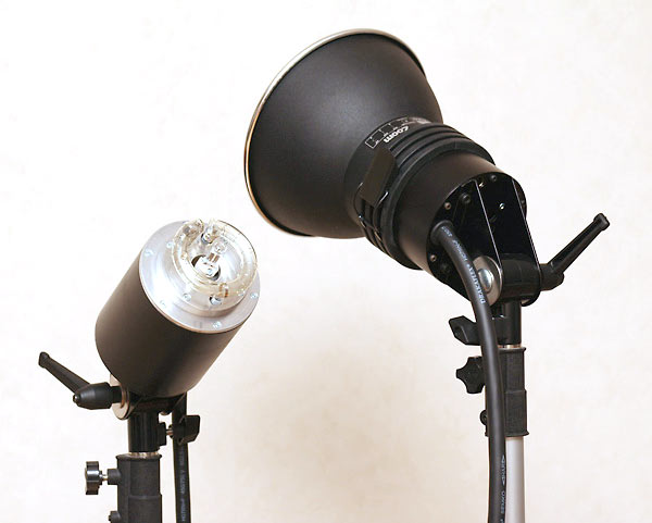 I have built two additional units of a simpler version of the type 2 head. These have 1200Ws tubes (just as Type 1) and a shorter body. 12V modelling bulbs (available up to 100W) are used in order that battery-powered modelling light can be used when shooting on-location. Of course, these also have fan cooling and an umbrella tube. The cabling is wired so that the modelling light becomes disconnected if the battery-powered head is used with a mains-powered generator.
